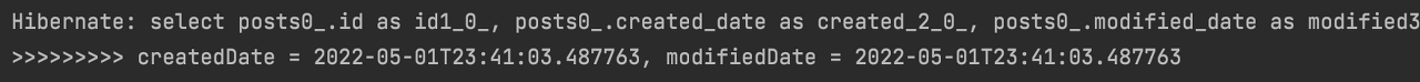 @Test void BaseTimeEntity_등록() throws Exception { //given LocalDateTime now = LocalDateTime.of(2022, 5, 1, 0, 0, 0); Posts posts1 = Posts.builder() .title("title") .content("content") .author("author") .build(); postsRepository.save(posts1); //when List<Posts> postsList = postsRepository.findAll(); //then Posts posts = postsList.get(0); System.out.println(">>>>>>>>> createdDate = " + posts.getCreatedDate() + ", modifiedDate = " + posts.getModifiedDate()); assertThat(posts.getCreatedDate()).isAfter(now); assertThat(posts.getModifiedDate()).isAfter(now); }Auditing 이 잘 되는지 확인 해보겠습니다. 아래와 같이 잘 되는것을 확인할 수 있습니다.