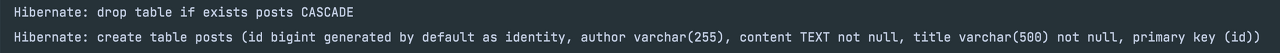 SQL 를 확인해보니 id bigint generated by default as identity 라고 나와있는걸 알 수 있습니다. 이는 h2 DB 의 문법을 따랐기 때문입니다. 이를 MySQL 문법으로 바꾸려면 해당 코드를 application.yml 에 추가하면 됩니다.