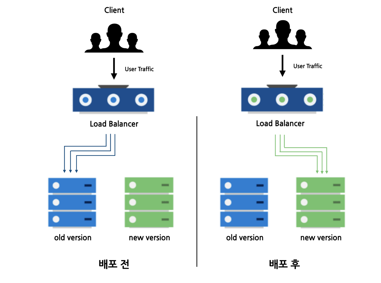 - 신 버전 배포가 진행되는 동안 구 버전으로 요청이 들어오기 때문에 서버 과부화를 원활하게 처리할 수 있습니다.