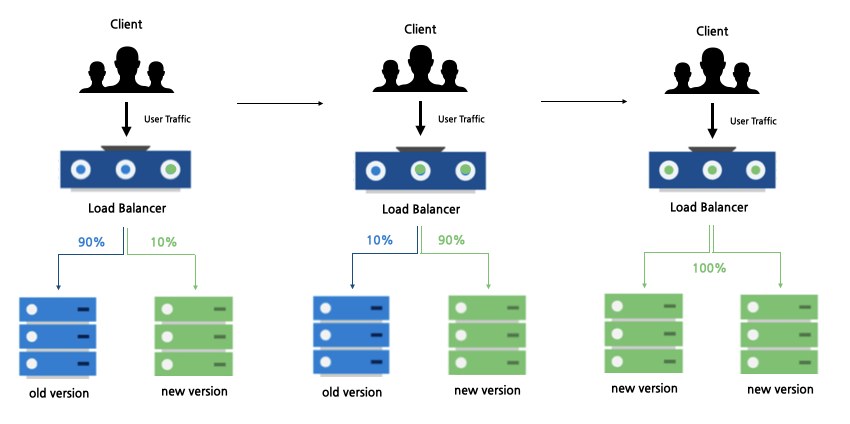 - 단계적인 전환 방식을 통해 부정적 영향을 최소화 하고 상황에 따라 트래픽 양을 늘리거나 롤백할 수 있습니다.