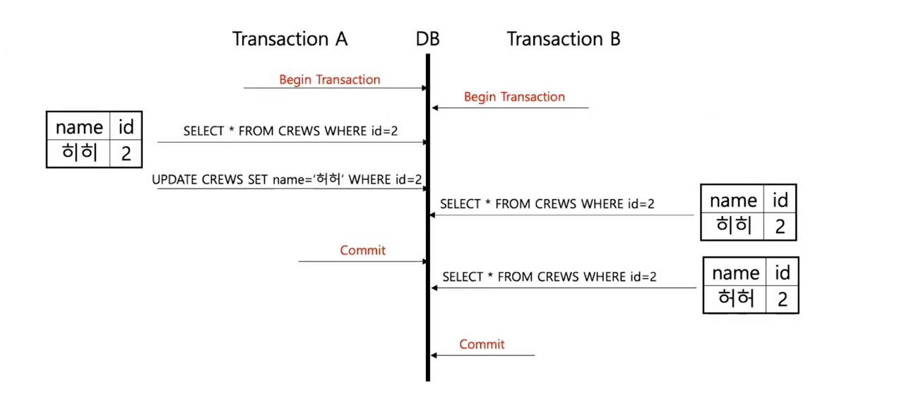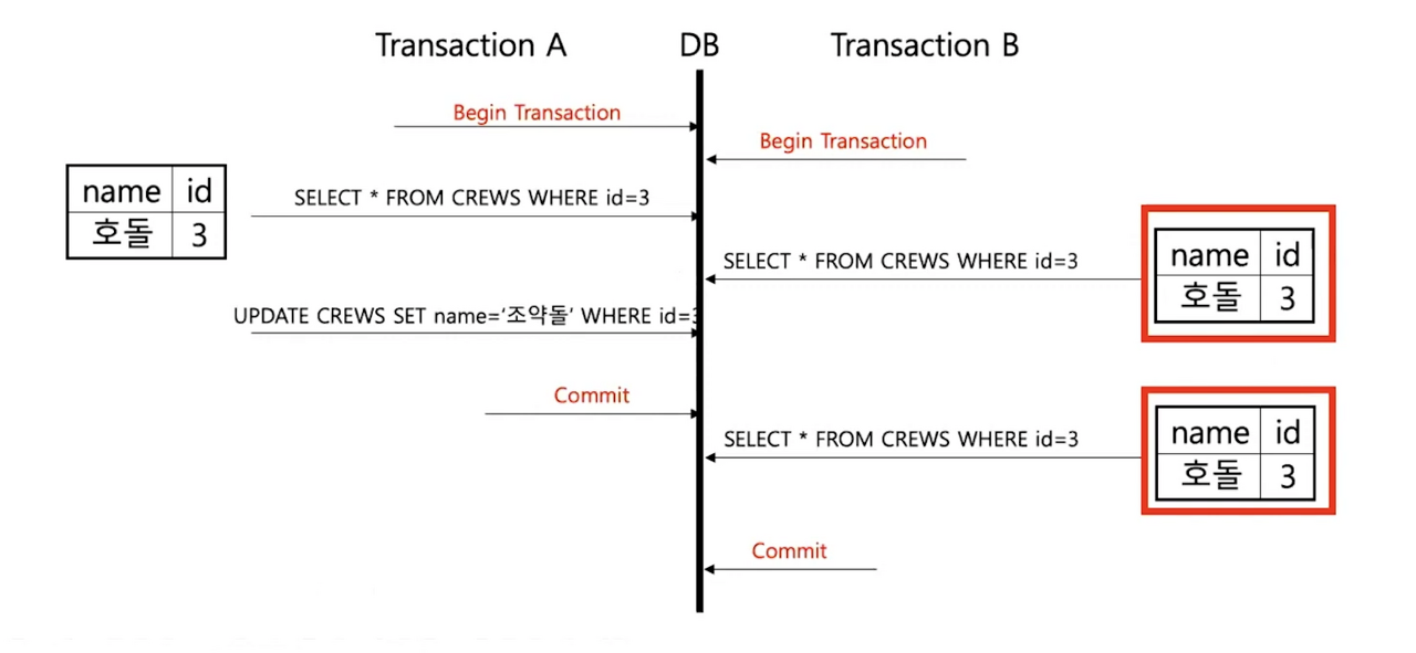 Non-Repeatable Read 는 위의 예에서 보듯이 Transaction B 내에서 select 문을 두번 조회했는데 두 값이 다른 값이 나오는 데이터 불일치 문제입니다.