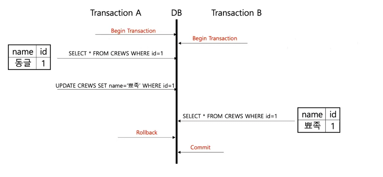 커밋이 완료된 트랜잭션의 변경사항만 다른 트랜잭션에서 조회 가능합니다. 트랜잭션이 이루어지는 동안 다른 트랜잭션은 해당 데이터에 접근이 불가능합니다.