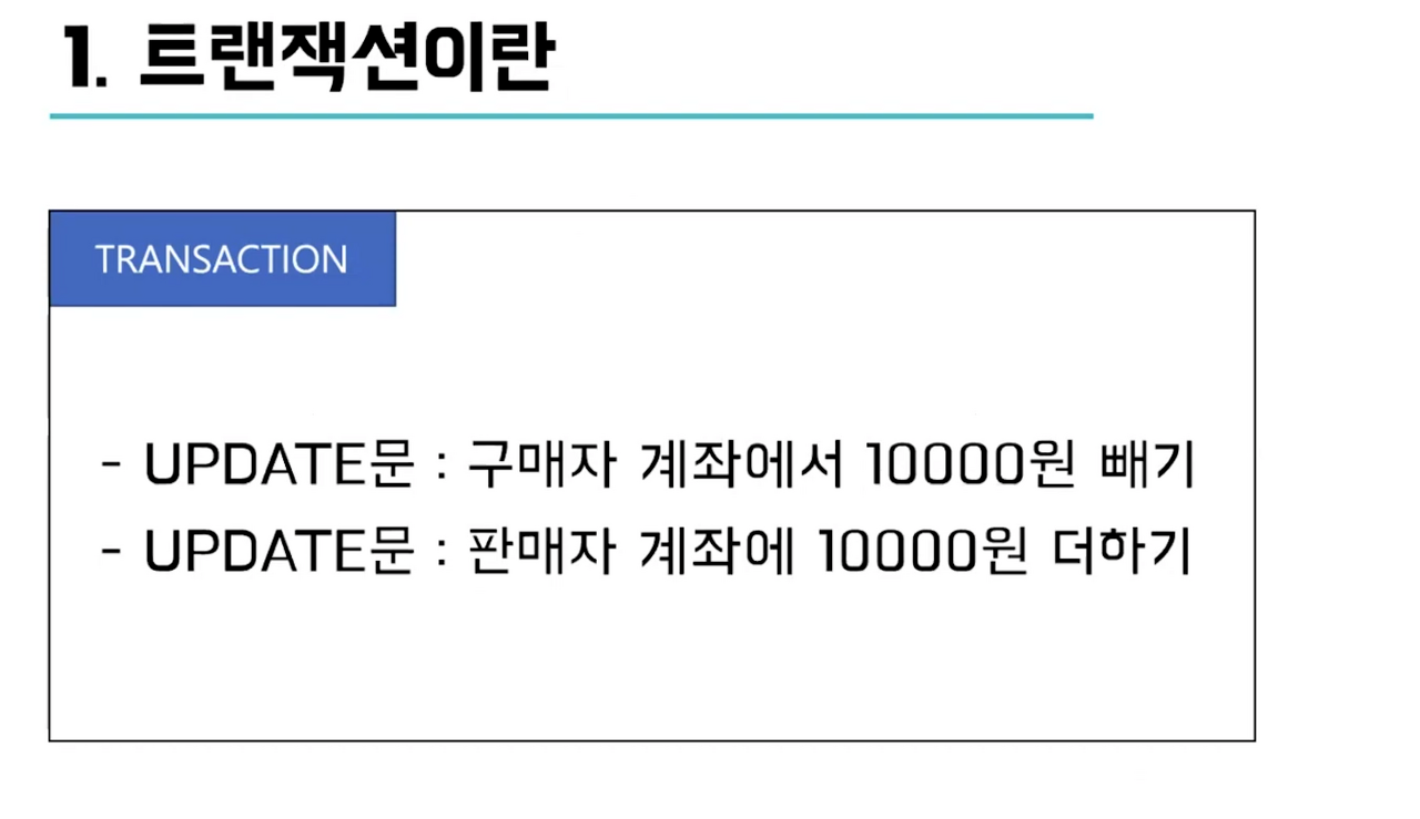 마음처럼 되면 좋은데 출금 성공후 서버 다운이라든지 하는 이유로 오류가 생길 수 있습니다. 구매자의 계좌에서는 돈이 빠졌는데 판매자의 계좌에는 돈이 들어가지 않는 이런 상황을 방지하기 위해 나온것이 바로 트랜잭션입니다.