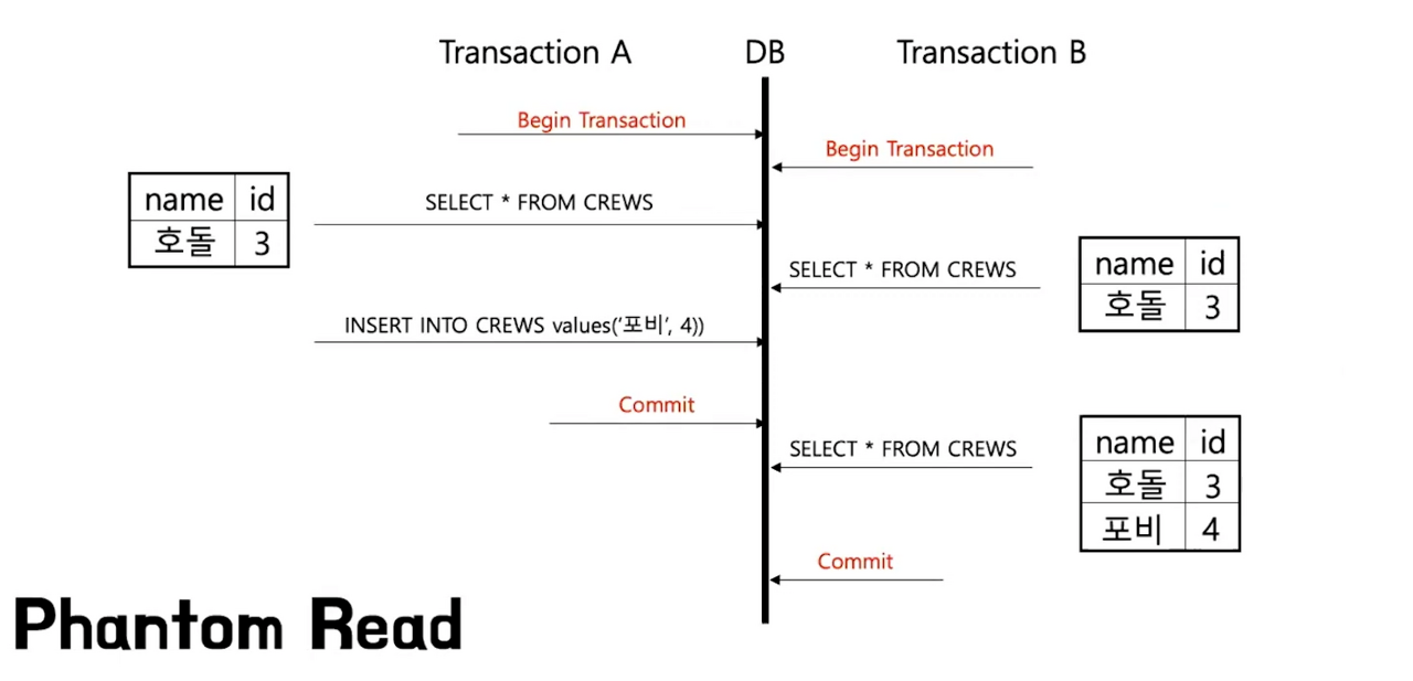 Phantom Read 는 Non-Repeatable Read 의 한 종류로 조건이 걸렸든 안 걸렸든 select 문을 쓸 때 나타날 수 있는 현상입니다. 해당 쿼리로 읽히는 데이터에 들어가는 행이 새로 생기거나 없어져 있는 현상입니다.