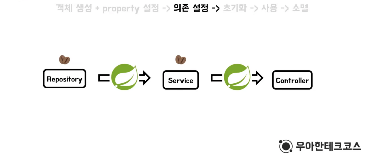 이렇게 Bean 객체가 생성이 되면 IoC 컨테이너는 의존 설정을 합니다 .이때 의존성 자동 주입이 일어나게 됩니다.