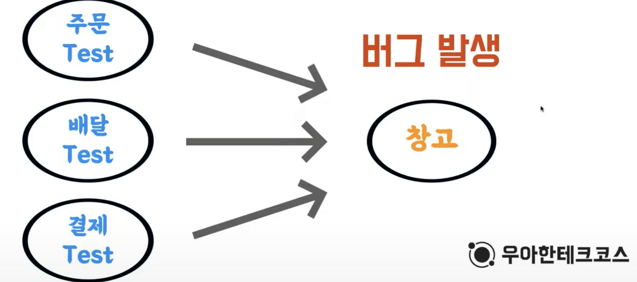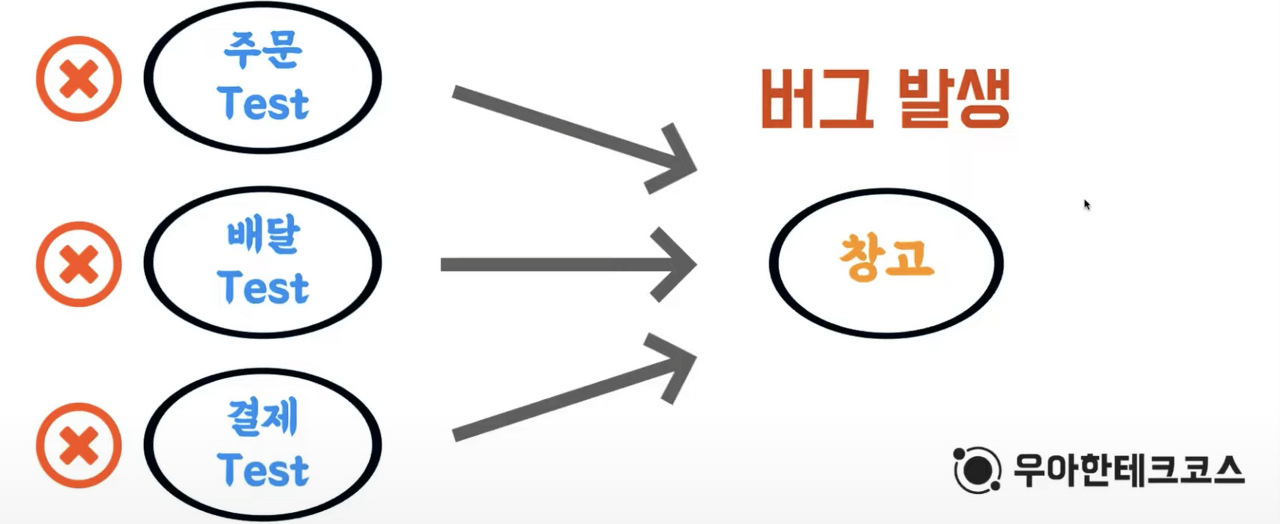 주문, 배달, 결제 테스트가 창고 객체와 직, 간접적으로 연결이 되는 상황에서 창고에서 버그가 발생한다면 협력 객체로 실제 창고를 이용하는 모든 단위의 테스트 또한 버그의 영향을 받게 됩니다.