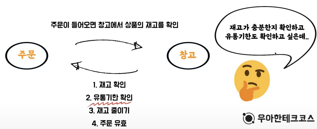 주문이 들어오면 창고에서 상품의 재고를 확인하는 과정을 거쳐야 합니다. 만약 재고가 충분하면 창고에 있던 상품의 재고가 줄어들고 주문이 유효해지는 상황입니다.