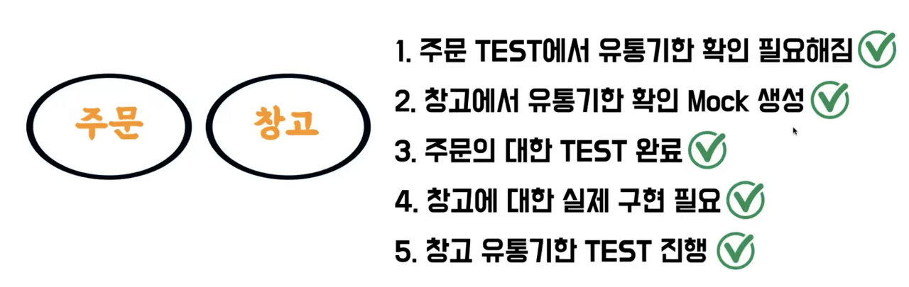// given Order order = new Order(식빵, 딸기잼, 우유); WareHouse mockWareHouse = mock(WareHouse.class); given(mockWareHouse.hasInventory(식빵, 딸기잼, 우유)).willReturn(true); given(mockWareHouse.isExpired(식빵, 딸기잼, 우유)).willReturn(false); // 추가 // when order.check(wareHouse); // then verify(mockWareHouse).hasInventory(식빵, 딸기잼, 우유); verify(mockWareHouse).isExpired(식빵, 딸기잼, 우유); // 추가 verify(mockWareHouse).remove(식빵, 딸기잼, 우유); 상품의 유통기간을 확인해주는 mock 을 추가해주고 이것이 호출되었는지 확인해야 합니다.