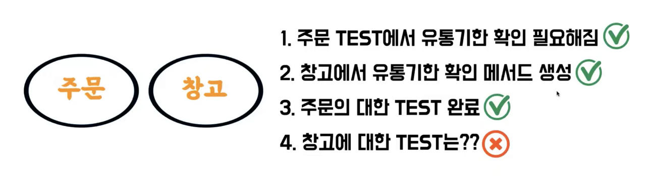 처음에 보았둔 주문과 창고에 대한 상황을 다시 보겠습니다. 만약 여기서 새로운 요구사항이 추가되면 어떻게 될까요? 원래는 재고가 있는지만 확인을 했지만 상품의 유통기한도 확인을 해야한다고 가정해보겠습니다. 기존에 있던 세가지 흐름에서 유통기한을 확인해야 하는 메서드가 추가된 것을 볼 수 있습니다. 이렇게 구현방법이 바뀌면 과연 이전에 진행했던 테스트는 어떻게 될까요?