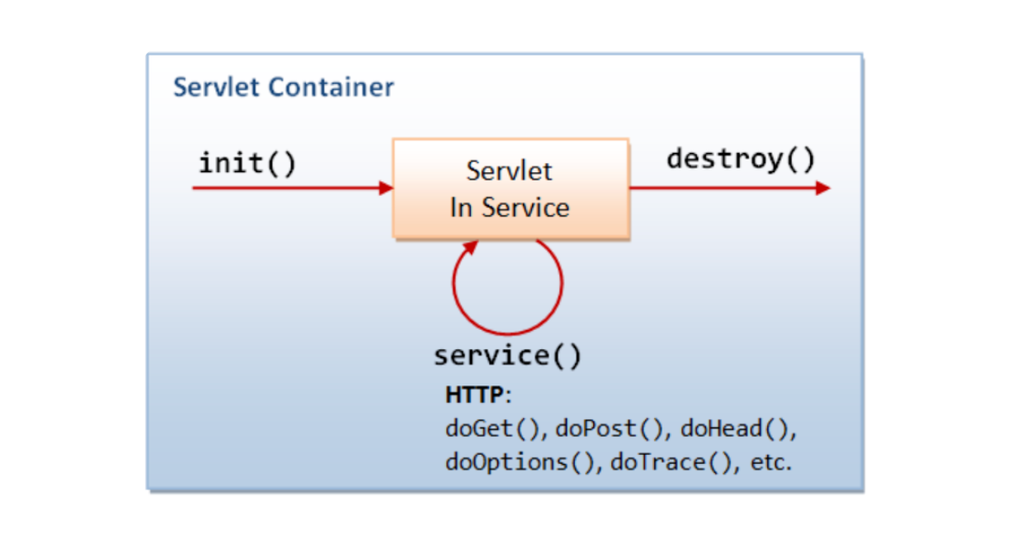 클라이언트의 요청이 들어오면 컨테이너는 해당 서블릿이 메모리에 있는지 확인하고, 없을 경우 init()메소드를 호출하여 적재합니다. Init()메소드는 처음 한번만 실행되기 때문에, 서블릿의 쓰레드에서 공통적으로 사용해야하는 것이 있다면 오버라이딩하여 구현하면 된다. 실행 중 서블릿이 변경 될 경우, 기존 서블릿을 파괴하고 새로운 init()을 통해 새로운 내용을 다시 메모리에 적재한다.