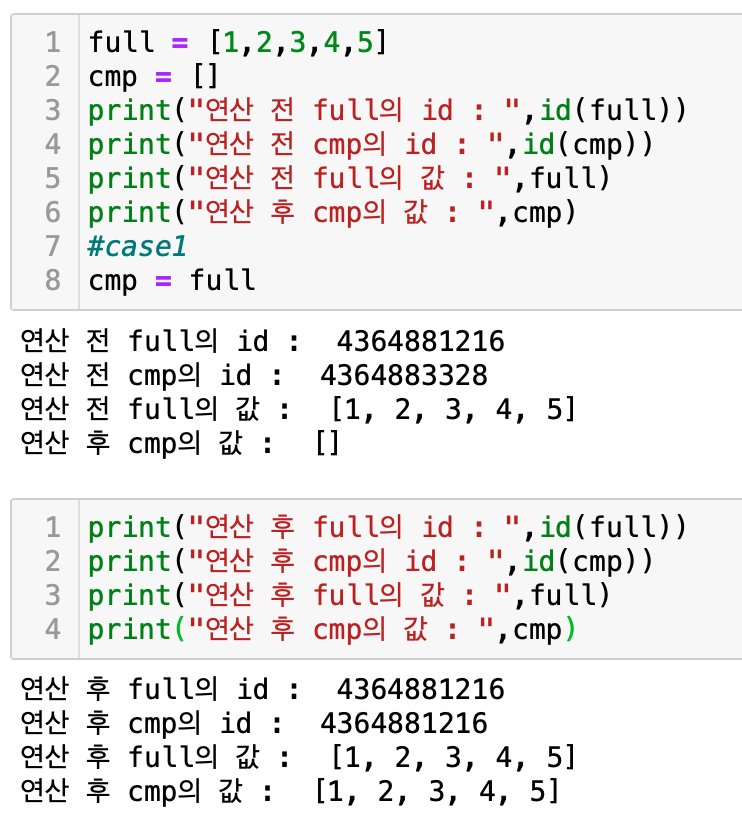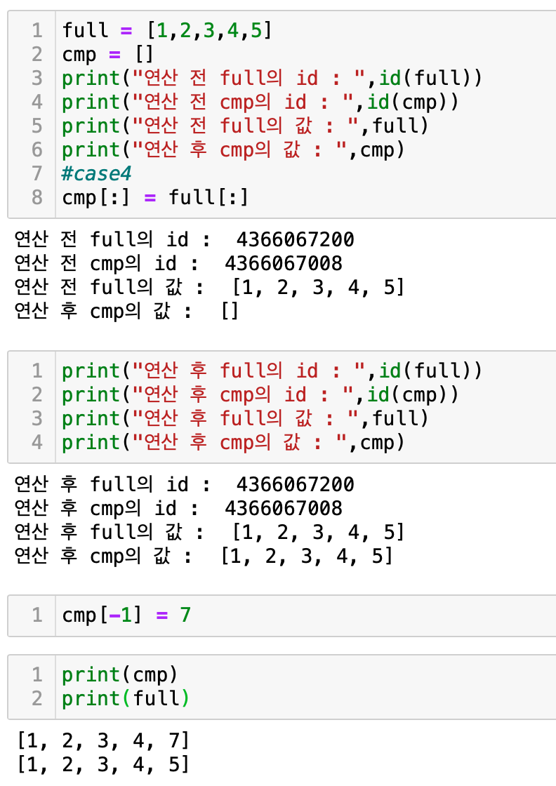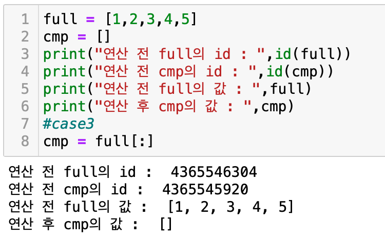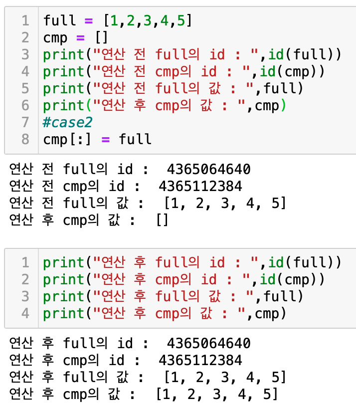 이제 2번 케이스의 경우 슬라이스([:])를 cmp의 앞에 해주었다. 이 경우는 값은 full과 동일하게 되지만 1번 케이스와 다르게 cmp의 주소는 연산전 cmp의 주소가 그대로 할당된다. "이런 연산을 어디서 해? 굳이 필요하나?" 라고 생각할 수있지만 공간복잡도가 O(1)인 경우에는 아주 요긴하게 사용된다.