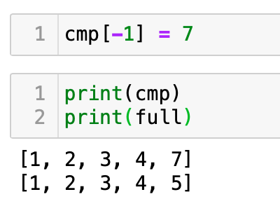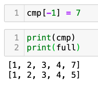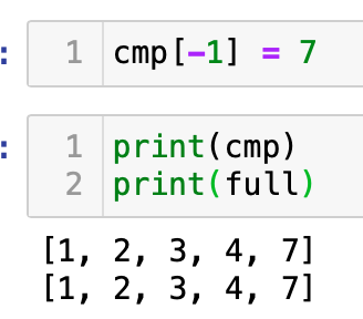 따라서 여기서 cmp와 full의 주소도 다르므로 cmp의 마지막 원소값을 바꾼다고 하여도 full의 원소값은 바뀌어 지지 않는다.