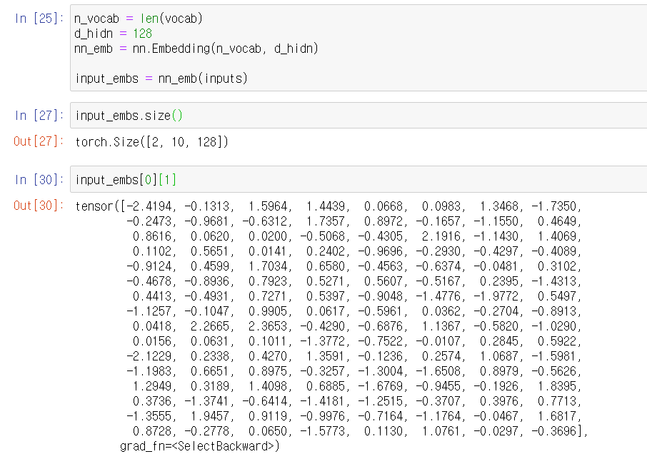 이제 이것을 embedding_size 128로 바꾼 것을 보여주고 있다. 즉 하나의 token을 128개의 벡터로 바꾼것이다.