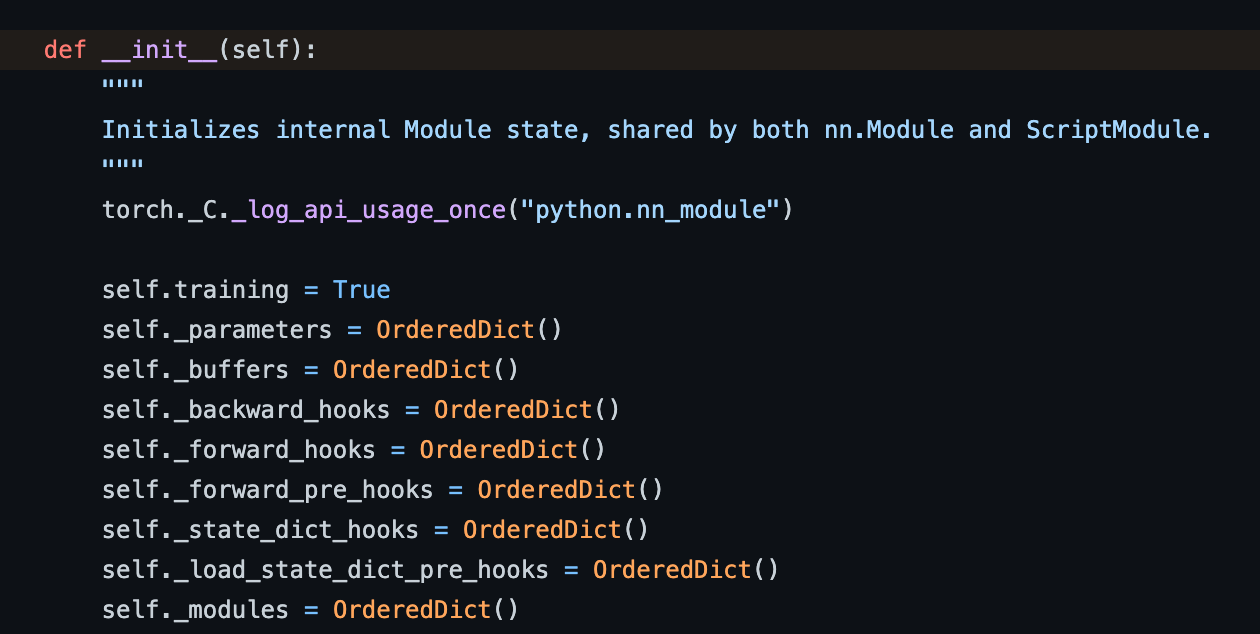 위의 코드는 pytorch에서 class Module(object): 의 __init__을 가져온것이다. 보다시피 self 외에 어떠한 파라미터도 갖지 않는 것을 볼 수 있다.