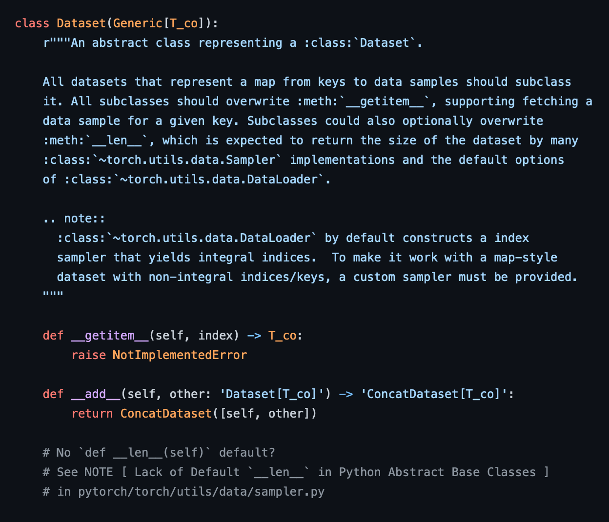 대표적인 예를 보여주자면 3번째 케이스에 해당 되겠다. torch.utils.data.Dataset 에 코드를 보면 아래와 같이 되어있다. 즉 def __init__ 이 없는 것을 볼 수 있다.