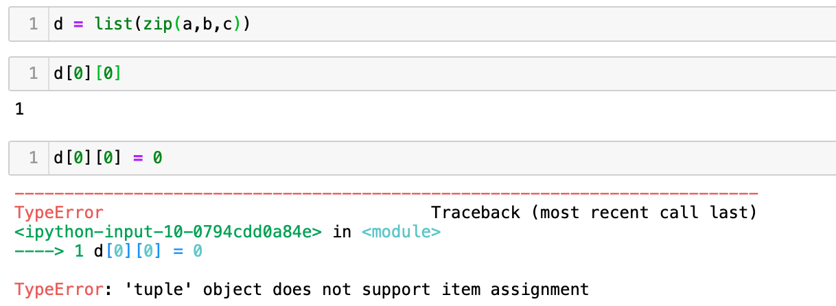 zip의 결과는 tuple 시퀀스를 만들기 때문에 값을 바꾸는 것이 불가능하다. 위 결과 처럼 튜플은 불변 객체이기 때문에 오류가 발생한다.