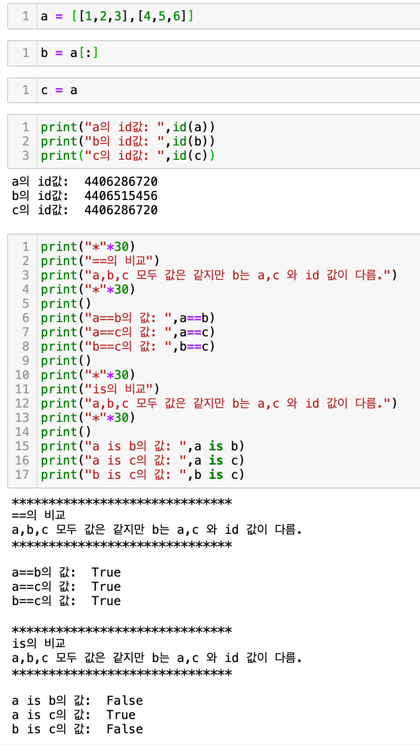 - is는 변수가 같은 Object 를 가르키면 True (같은 Object 인것인지를 확인하기 위해서는 id 함수를 사용하면 된다.)