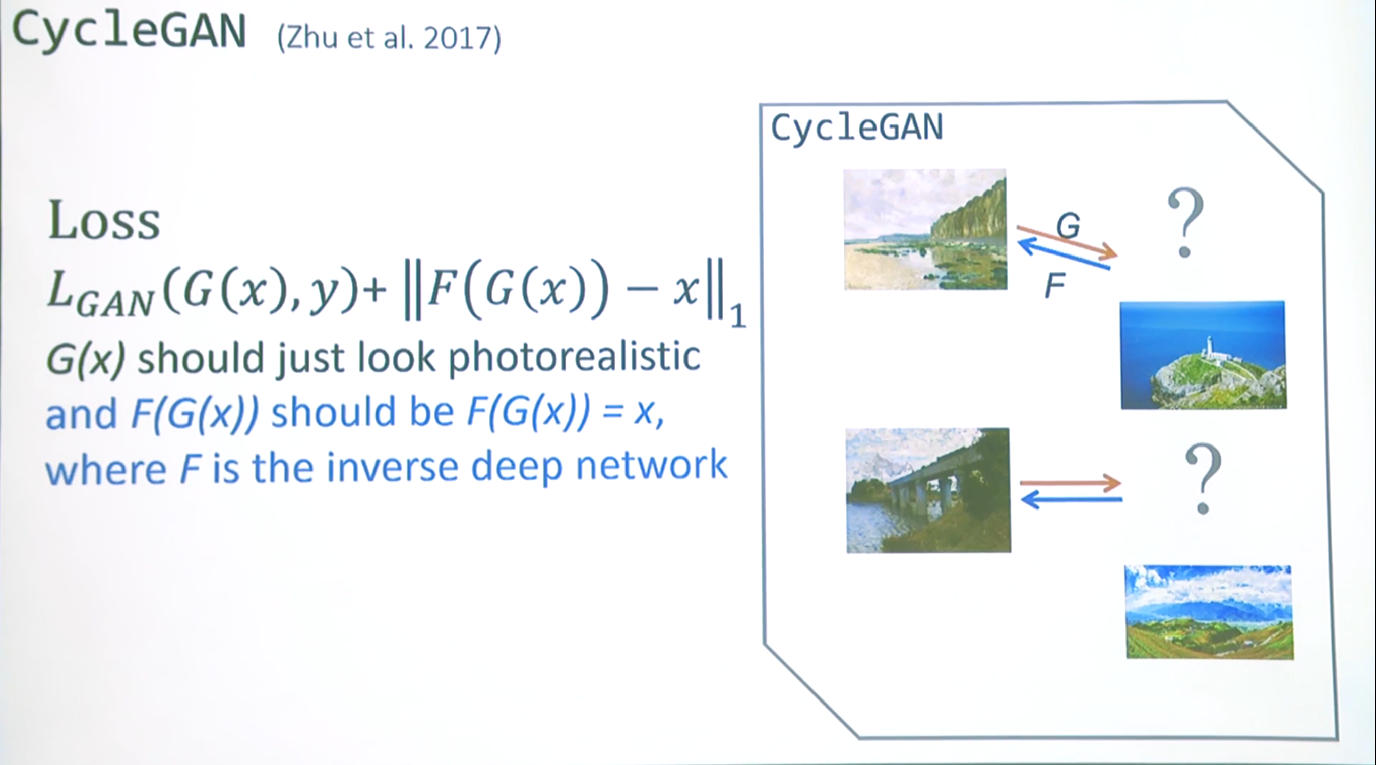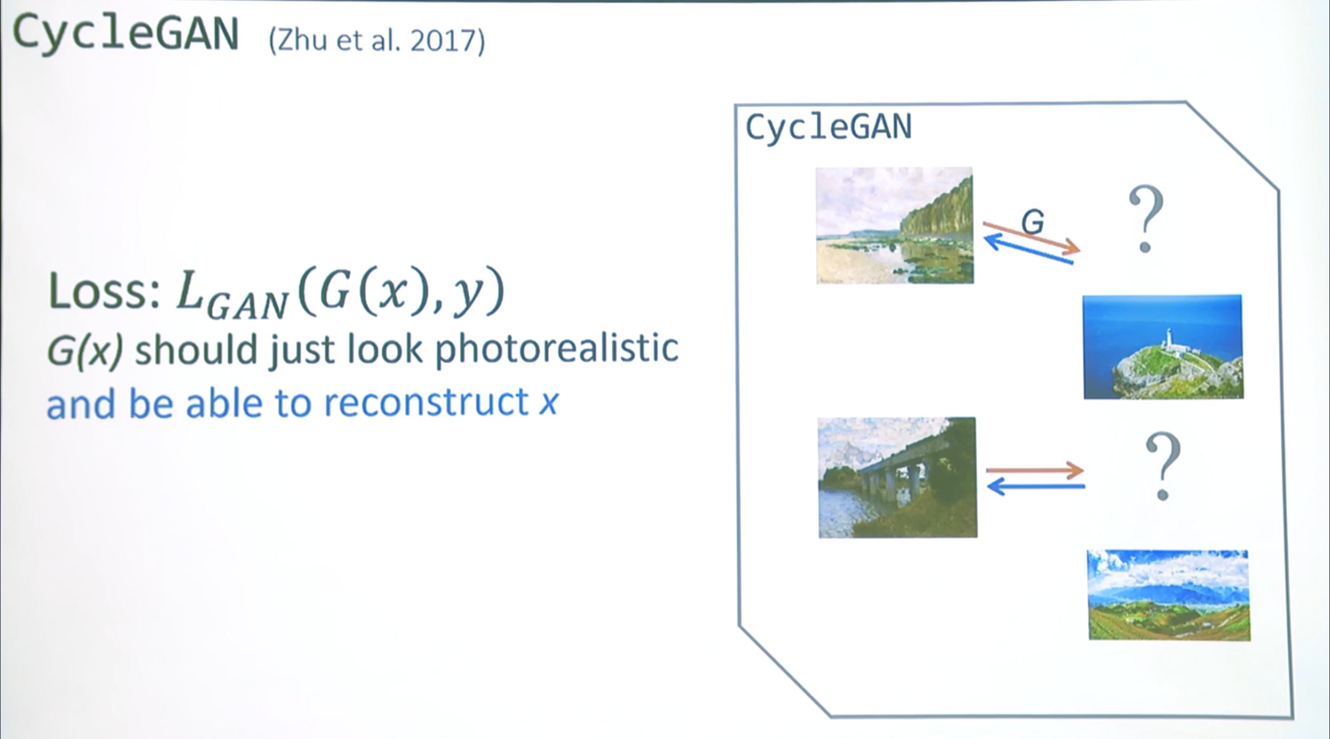cycleGAN의 key object는 input을 주었을 때 해당 input을 의도한 방향으로 바꾸는데 이걸 다시 원래의 input으로 되돌릴때 변환 가능 할 수 있도록 이를 바꾸라는 것이다. 즉 아래의 사진을 보면 왼쪽이 모네의 그림이고 오른쪽에 있는 것이 모네가 그림을 그린 장소를 모네의 구도와 상관 없이 실제 사진으로 찍은 것이다. 이때 모네의 그림을 사진으로 Generator가 만들gfhiusdkjdfhjghdsiughdsiughiurehtuihralgihoirtghirhjto수 있어야 하지만 또한 사진을 모네의 그림으로 표현할 수 있어야 한다. 함수 G는 모네의 그림을 사진으로 바꾸는 함수이고 F는 사진을 du모네의 그림으로 바꿔주는 함수를 이야기 한다.