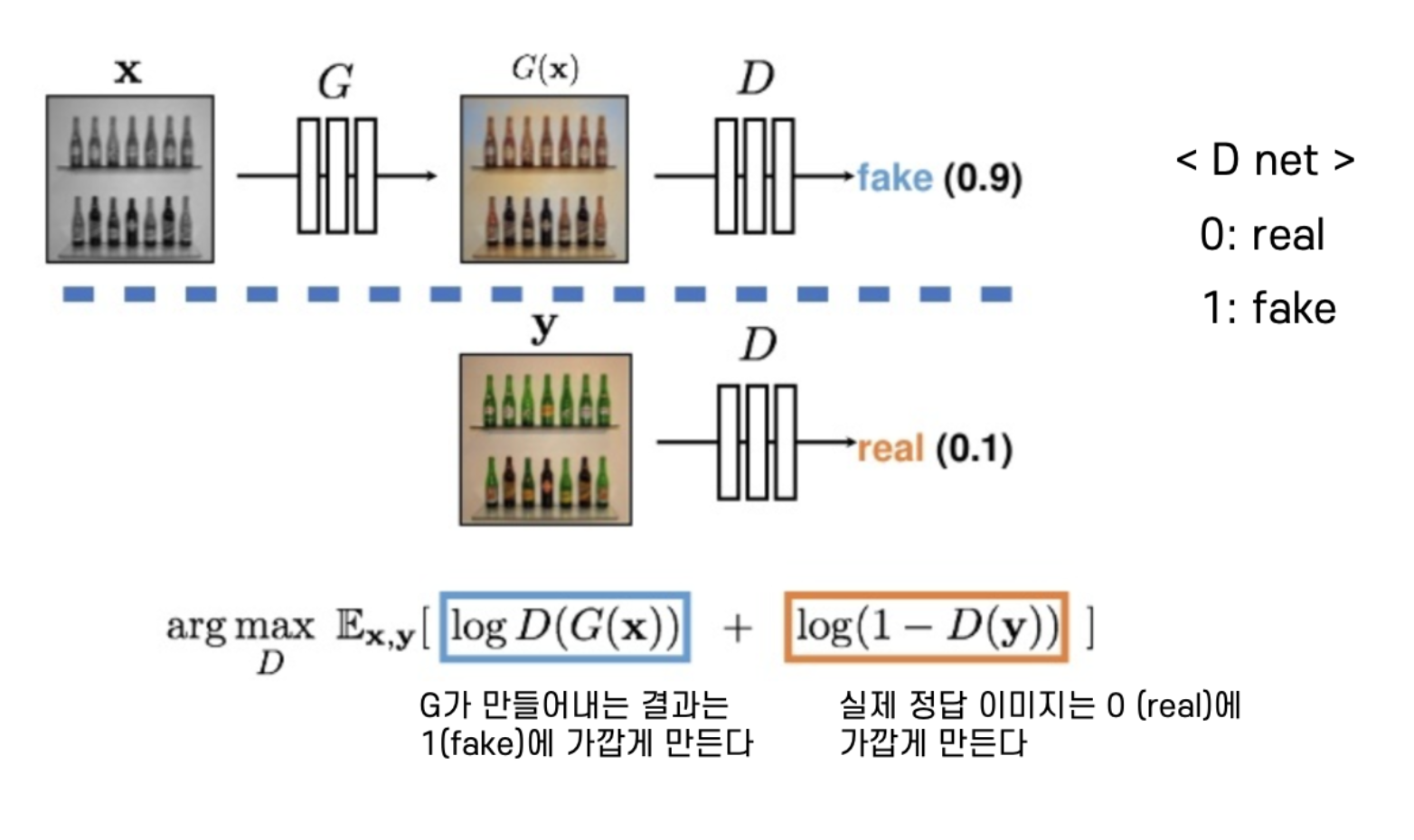 위의 수식은 Discriminator의 목적함수 이다. D net(discriminator net) 입장에서는 0에 가까우면 real(Ground Truth), 1에 가까우면 fake 이미지로 구별한다. 즉 G net(Generator net) 가 만들어낸 결과는 fake(1) 에 가깝게 만들고 실제 정답 이미지는 real(0)에 가깝게 만든다.