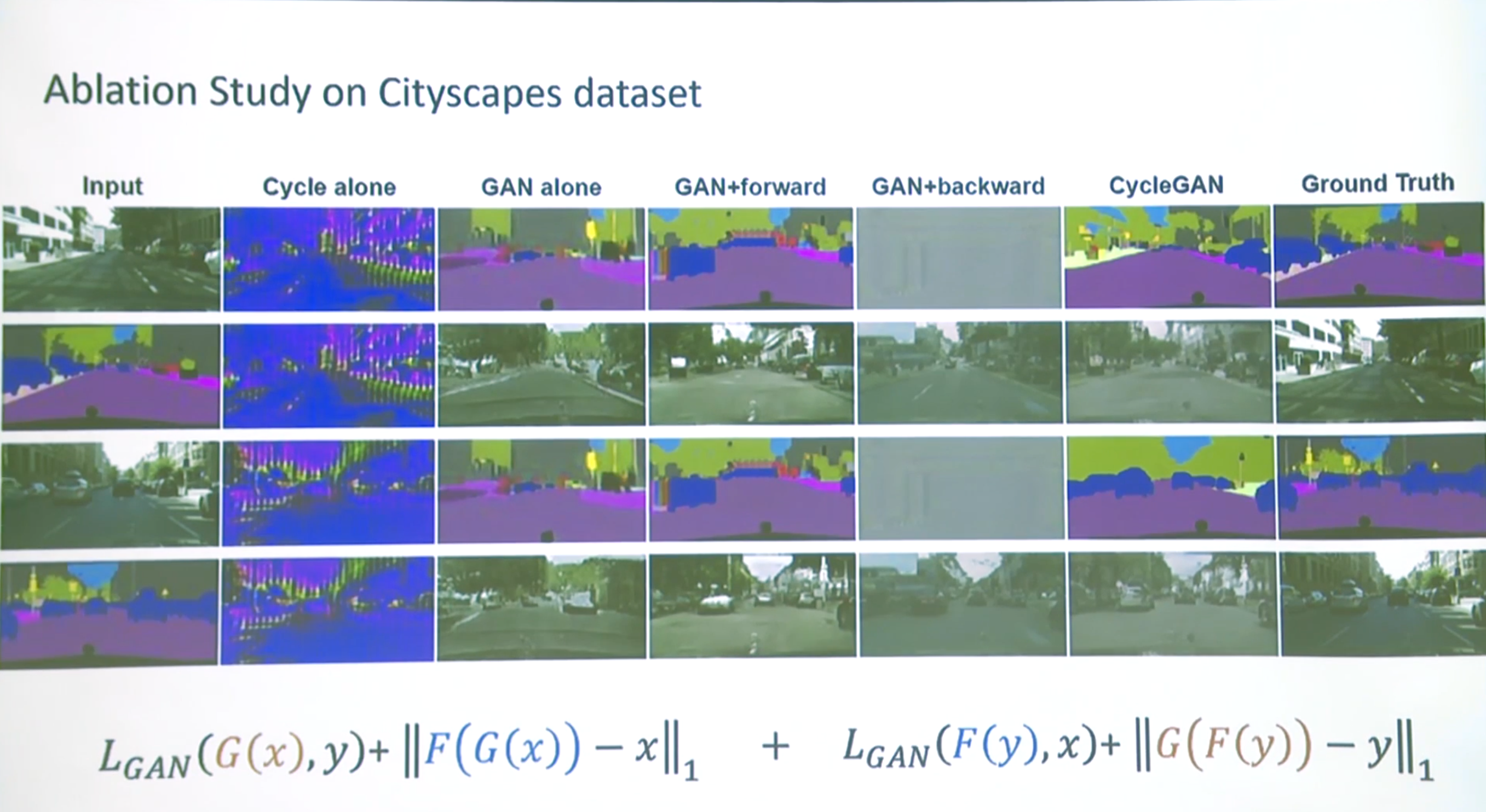 여기서 Cycle alone 은 GAN loss를 사용하지 않은 것을 이야기 하고 GAN alone은 Cycle 즉 l1 loss를 사용하지 않을 것을 보여주고 있다. GAN+forward는 앞에 Term(Lgan(G(x),y) + ||F(G(x)) - x||1 만 한것이고 GAN+backward는 뒤에만 한것을 의미한다.