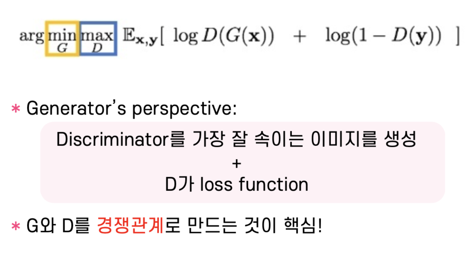 여기서 중요한 점은 G와 D를 경쟁관계로 만드는 것이다. G의 loss function은 항상 고정된 것이 아니라 D를 이겨내는 목표로 학습된다는 개념이 중요하다.