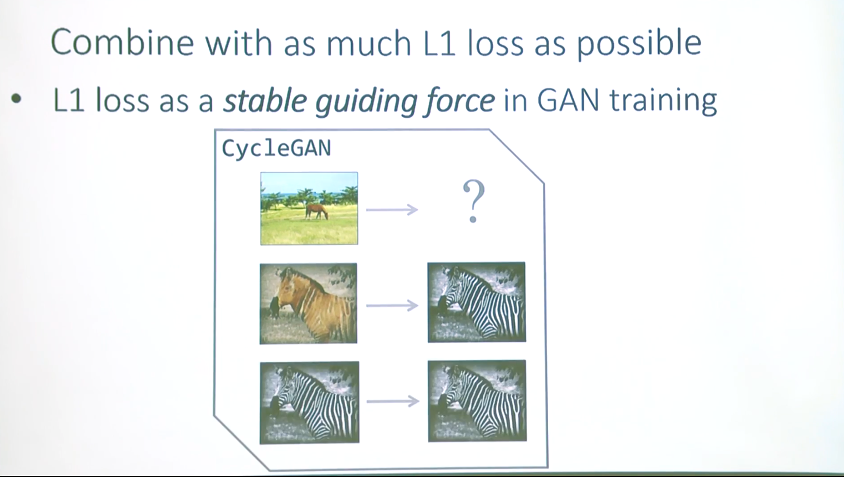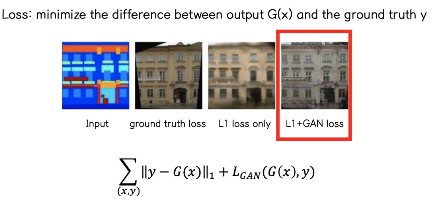 더 좋은 결과를 얻기 위하여 또한 GAN에 L1 loss를 넣어주면 학습이 좀 더 용이하게 된다고 한다. L1 loss가 stable guiding force 역할을 해준다고 한다. 저자의 설명으로는 큰 방향으로는 L1 loss를 통해 학습하고 작은 부분을 GAN을 이용하여 학습을 진행하는 것이라고 이해하면 된다고 한다.