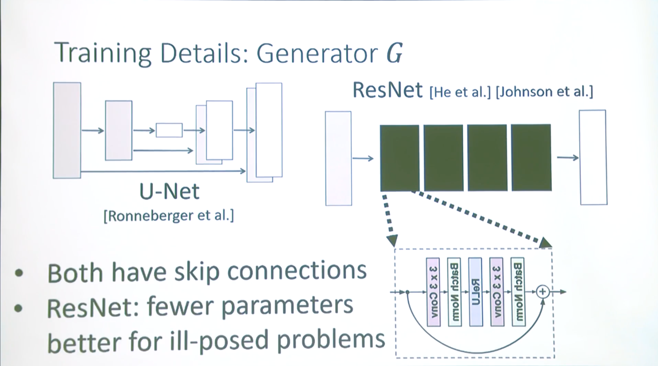 U-net(encoder - decoder network 에 skip connection 만 한 것 )을 사용했다고 한다. 이 경우 skip connection 때문에 detail이 더 살아 있다고 할 수 있다 하지만 디테일을 살려야 하기 때문에 skip connection에 의존을 많이 한다고 한다. 하지만 depth가 깊지 않기 때문에 문제가 된다고 한다. 따라서 이를 타개하고자 ResNet을 사용하여서 깊이도 깊고 skip-connection도 이용하여 데이터 사진의 디테일한 부분을 다 간직할 수 있게 된다. 따라서 CycleGAN 같은 경우 결과물을 보면 형태가 잘 간직된것을 볼 수 있다. 하지만 input의 디테일한 부분을 다 갖고 있기 때문에 모양의 형태등을 바꾸는 것은 어렵다고 한다.