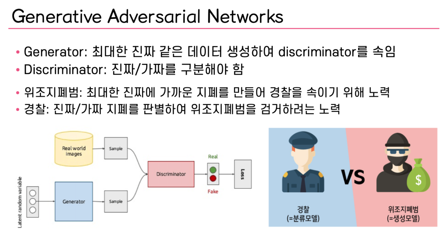 여기서 Generator와 Discriminator는 각각, 위조지폐범과 경찰로 생각할 수 있다. Generator는 Discriminator가 눈치챌 수 없도록 Ground Truth와 차이가 안나기 위해 노력하고 Discriminator는 Generator가 생성한 결과물을 정확히 판별하도록 노력한다.