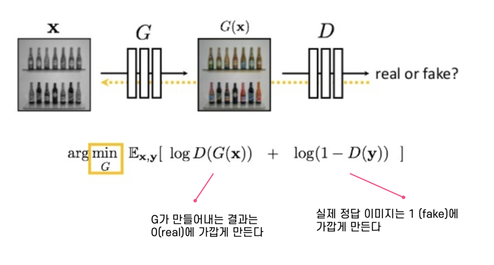 실제 예시를 들어보면 아래 GAN의 목적은 흑백사진을 컬러사진으로 만들어 내는 것이다. Generator 네트워크는 자신이 만든 결과물 G(x)로 Discriminator를 속이려고 하고 , Disciminator 네트워크는 G(x)를 구별해내려고 한다.