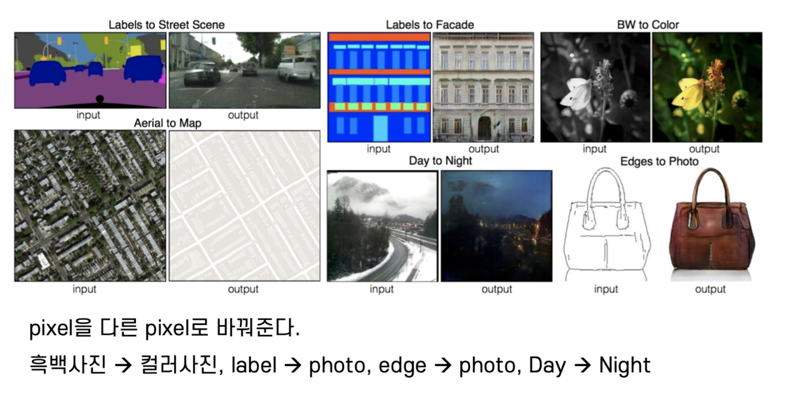 pixel to pixel은 말 그대로 하나의 픽셀을 다른 픽셀로 바꿔준다는 의미이다. 아래 이미지와 같이 흑백사진을 컬러사진으로 바꾸거나, label만 부여한 input에 대해 실제 이미지를 생성하거나, edge만 있는 input 에 대하여 완전한 output을 만들어 내는데 사용한다. 아래의 사진을 참고하면 이해하기 더 용이하다.