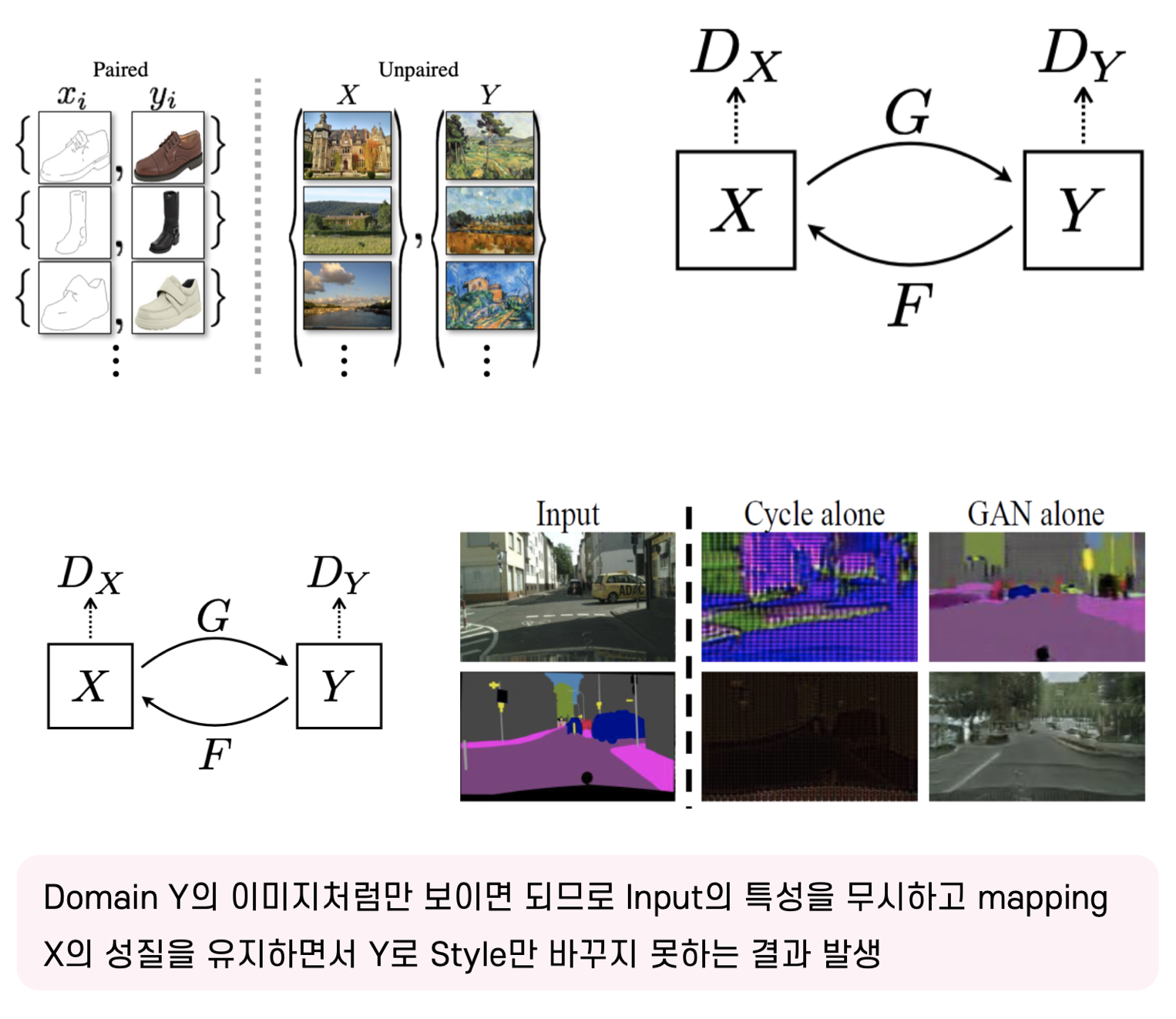 pix2pix는 GAN loss를 합친 목적 함수를 이용하여 성능을 높였지만 training data가 pair로 존재해야만 한다는 한계점이 존재한다. 흑백 사진을 컬러 사진으로 바꾸기 위한 training dataset은 구성하기 쉽지만, 피카소와 달리 등의 그림을 실물 이미지로 바꾸기 위한 데이터셋을 구성하기는 현실적으로 불가능하다. 따라서 이런 한계점을 극복하기 위해 cycleGAN이 등장하였다.