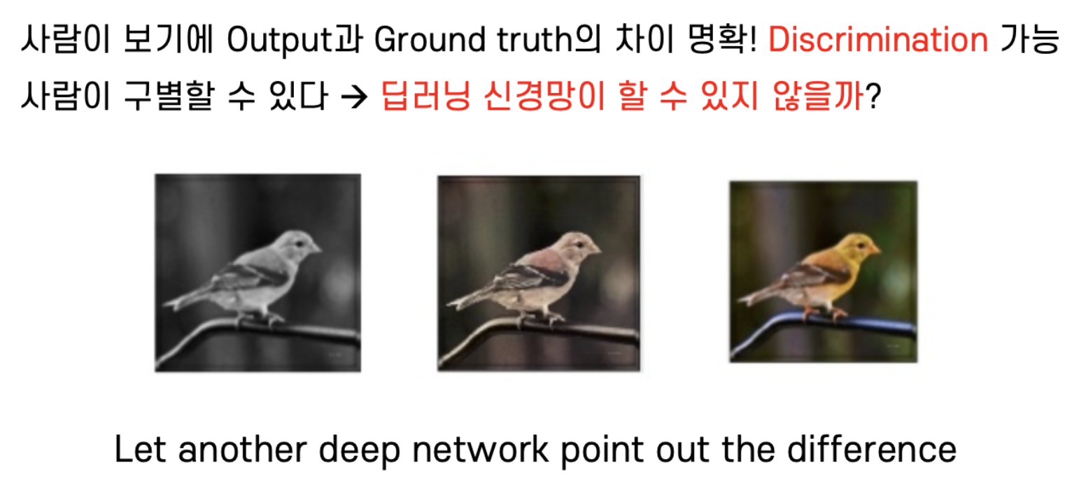 여기서 이상한 점이 network가 생성한 output은 상대적으로 뿌옇게 보이는 것을 확인할 수 있다. 이런 현상이 일어난 이유는 network는 어떤 색으로 칠해지는 것이 정답인지를 모르기 때문에 가장 손해를 보지 않는 중간값을 선택하기 때문이라고 한다.