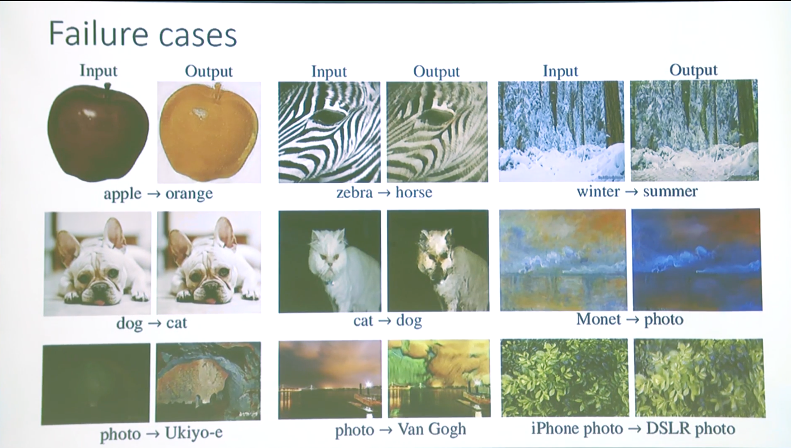 실패 사례(형태) 이건 모델의 문제라기 보다는 데이터셋의 문제라고 생각할 수 있다. CycleGAN에서 ImageNet 데이터셋을 가지고 학습을 진행하였는데 데이터셋에서 wild Horse의 경우 사람이 타고 있는 경우가 없었다. 그래서 Discriminator를 속이기 위해서는 모델내에서 사람도 얼룩형태로 되어야 속일 수 있다고 판단하고 산출한 결과라고 한다. 만약 데이터셋에서 말을 사람이 타고 있는 사진이 있었다면 잘 처리했을 것 같다고 한다.