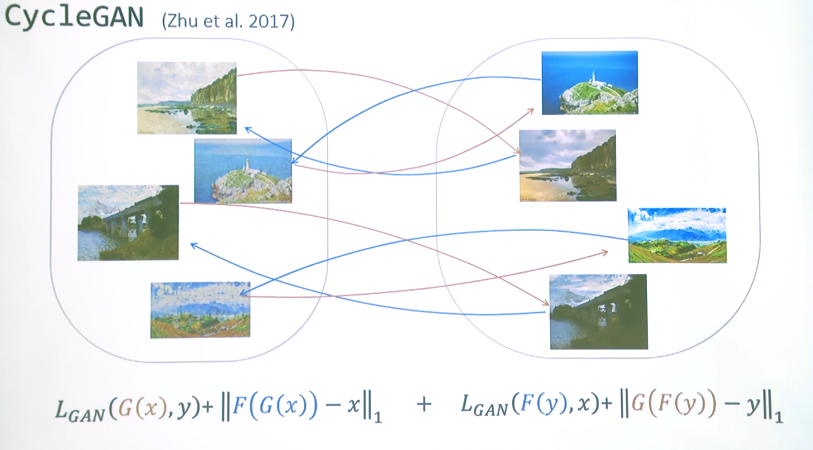 cycleGAN의 key object는 input을 주었을 때 해당 input을 의도한 방향으로 바꾸는데 이걸 다시 원래의 input으로 되돌릴때 변환 가능 할 수 있도록 이를 바꾸라는 것이다. 즉 아래의 사진을 보면 왼쪽이 모네의 그림이고 오른쪽에 있는 것이 모네가 그림을 그린 장소를 모네의 구도와 상관 없이 실제 사진으로 찍은 것이다. 이때 모네의 그림을 사진으로 Generator가 만들gfhiusdkjdfhjghdsiughdsiughiurehtuihralgihoirtghirhjto수 있어야 하지만 또한 사진을 모네의 그림으로 표현할 수 있어야 한다. 함수 G는 모네의 그림을 사진으로 바꾸는 함수이고 F는 사진을 du모네의 그림으로 바꿔주는 함수를 이야기 한다.