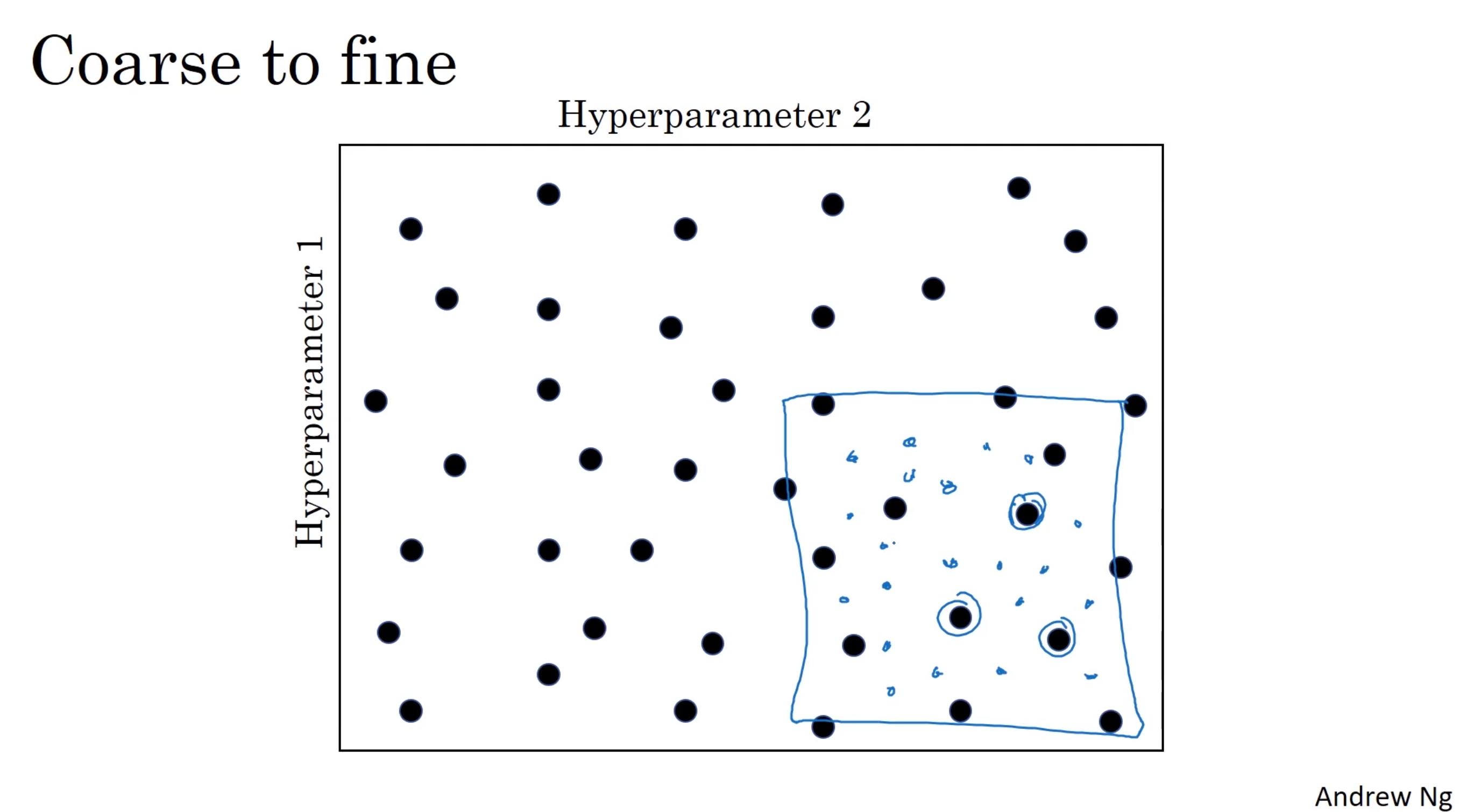 From Rough to Fine 또한 하이퍼파라미터를 탐색하는 방법중엔 Coarse to fine 과 같은 방법도 있다. 해당 방법은 우선 어떤 점에서 가장 결과값이 좋았다면 그 점 주변으로 가장 좋은 값이 있을 확률이 높기 때문에 그 점 주위만 다시 조밀하게 세분화 해서 값을 비교해 보는 방식을 취한다.