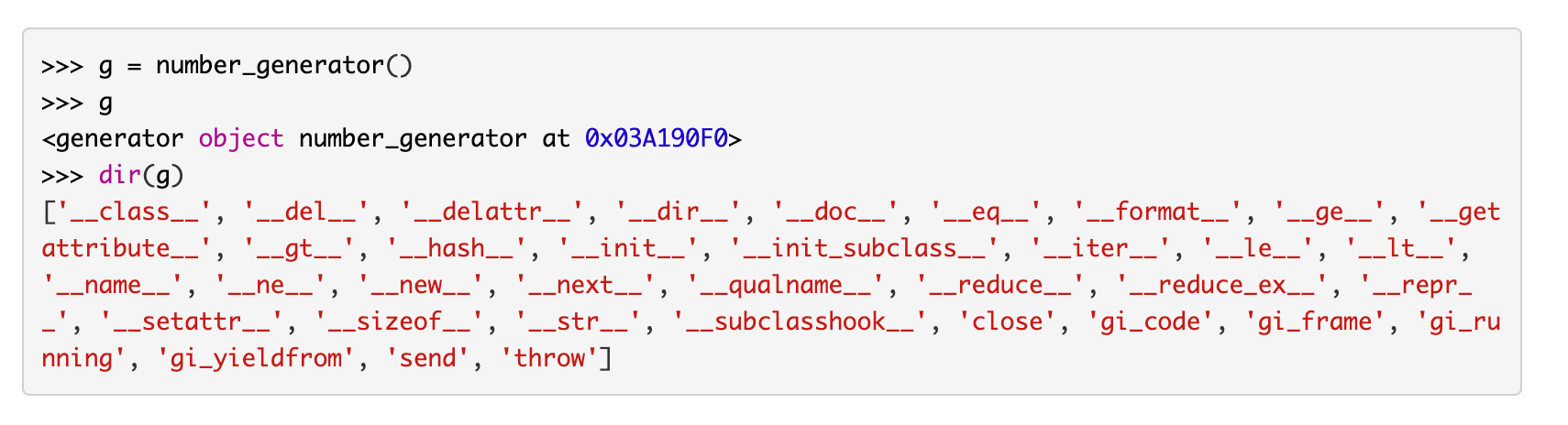 또한 number_generator의 반환값을 g변수에 넣어 g가 어떤 object인지 확인해보면 __iter__와 __next__가 구현된것으로 보아 iterator라는 것을 알 수 있다.