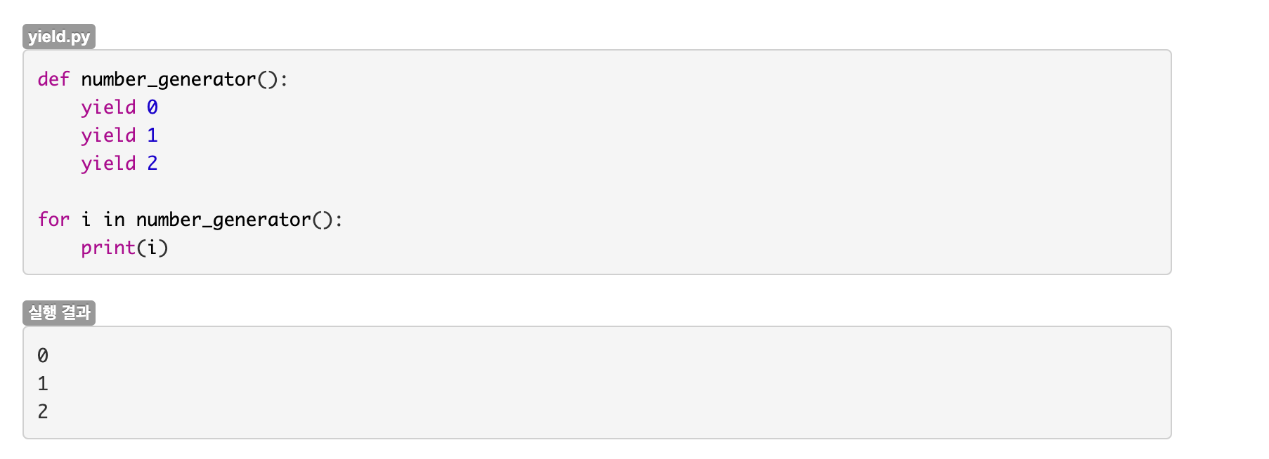 즉, yield를 사용하면 값을 함수 바깥으로 전달하면서 코드 실행을 함수 바깥에 양보를 한다.