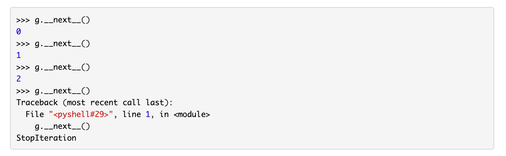 generator class의 object인 g에 __next__ 메소드를 호출한 결과 0, 1, 2가 나오다가 StopIteration 예외가 발생한다.