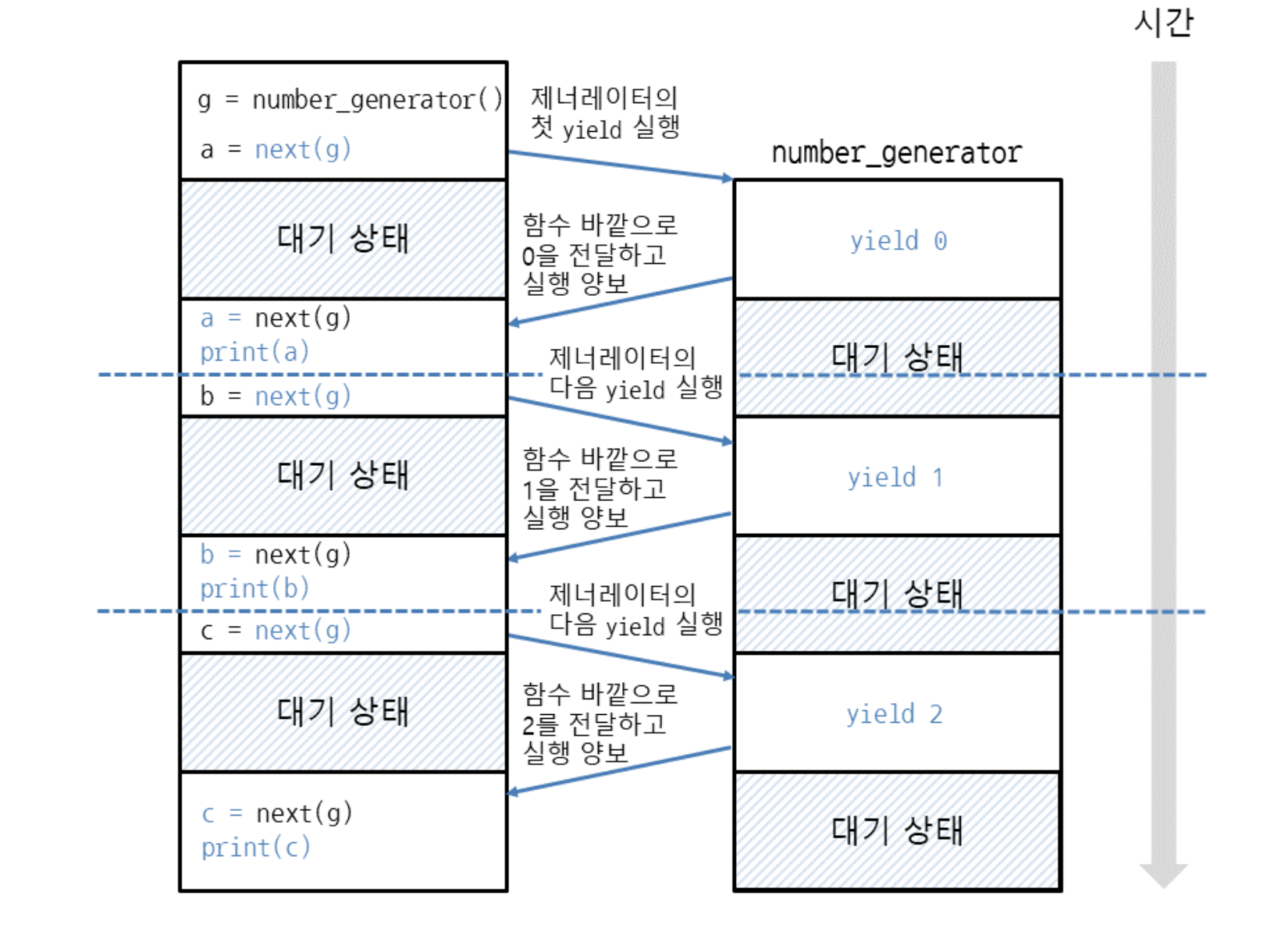위의 형태로 예시를 들 수 있겠다. 처음에 g를 선언하고 next를 호출하면 number_generator로 가서 yield 까지 실행시키고 이 값을 함수 바깥으로 전달하고 자신의 시행을 양보한다. 그다음 또 b=next(g)를 실행하여 다시 number_generator로 가 yield 0이후의 코드인 yield 1을 실행시킨다. 이러게 진행해 가면서 함수가 진행된다.