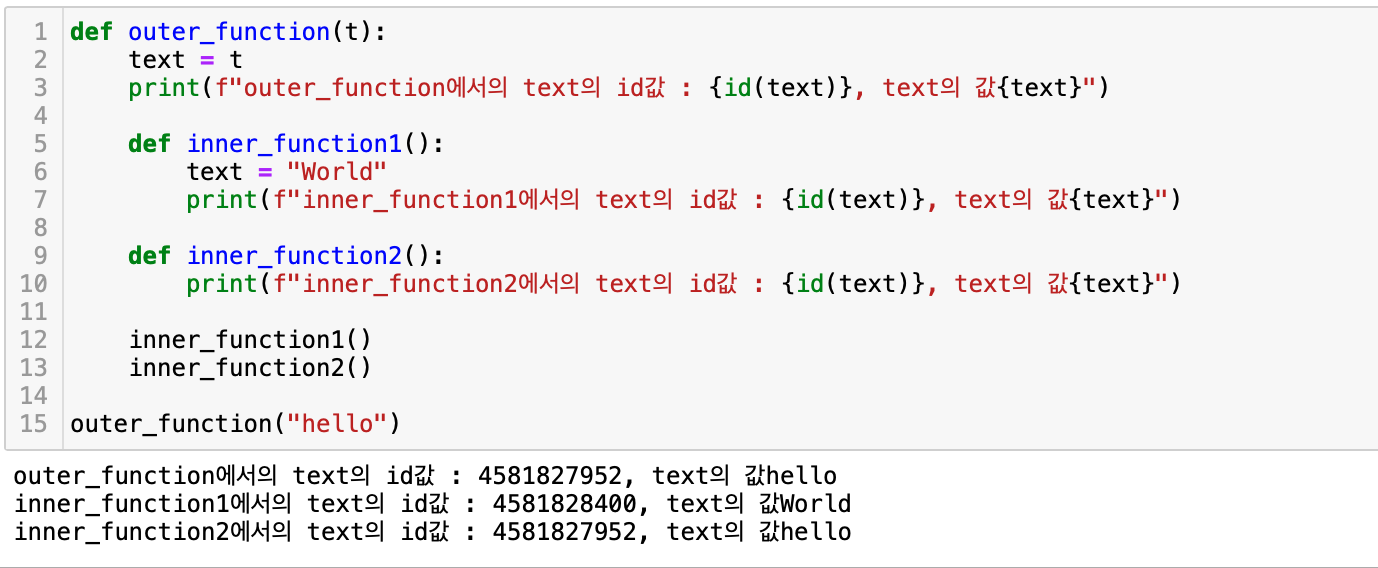 재할당 여기서는 불변 객체인 문자형을 예시로 들었다. 문자열은 불변 객체이기 때문에 조작할 수 없다. 값을 변경하려면 text ="word"와 같은 경우형태로 새롭게 재할당 할 수 밖에 없다. 그결과 id 값을 확인해보면 inner_function1과 outer_function에서의 text의 의 id 값은 서로 다른것임을 알 수 있다.