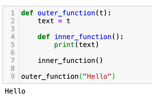 nested function 여기서 outer_function()은 inner_function을 호출했고, 아무런 파라미터도 넘기지 않았지만 부모 함수의 text 변수를 자유롭게 읽어 들여 그 값인 "Hello"를 출력했다. 이처럼 매번 파라미터를 전달하지 않아도 되기 때문에 구현이 깔끔해진다는 장점이 있다. 또한 가변 객체(list, dict, set)인 경우 append(), pop(), 원소 변경(a[i][j] = 1)등 여러가지 연산으로 조작도 가능하다.
