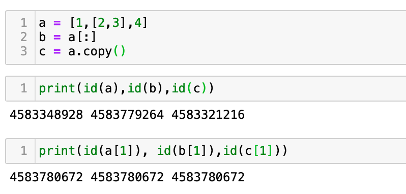 c만 다르다 [:]로 처리한 변수 c는 다른 ID를 갖는 것을 확인 할 수 있다. 참조로 처리된 변수 b는 a와 동일한 ID를 갖지만 변수 c는 값 자체가 복사되어 새로운 개체가 되었다. 이외에도 좀 더 직관적으로 처리 하는 방법은 다음과 같이 명시적으로 copy 메소드를 사용하는 것이다.