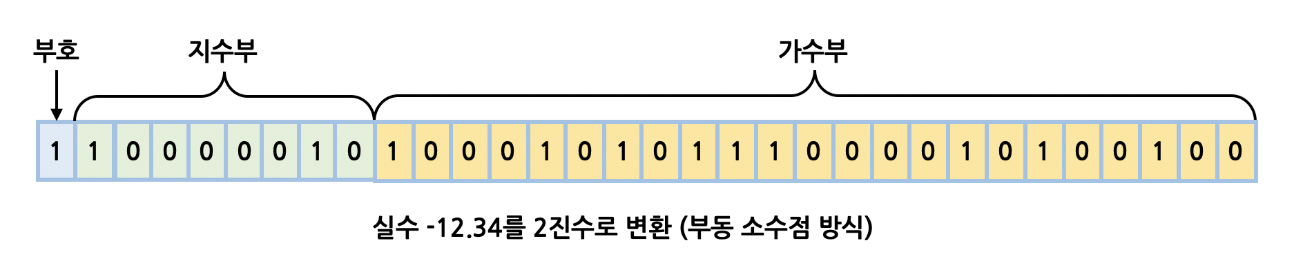 - 만약 -12.34 를 부동 소수점 방식으로 표현해보면 아래와 같습니다.