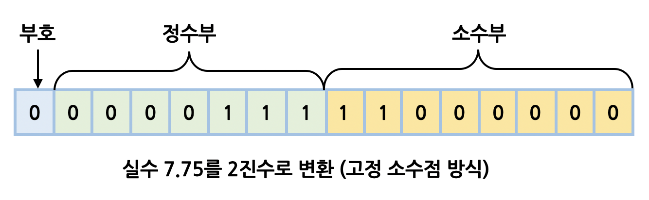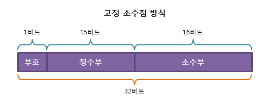 - 고정 소수점은 부호, 정수부, 소수부를 표현하는 3부분으로 나뉘고 크기가 고정되어 있습니다.