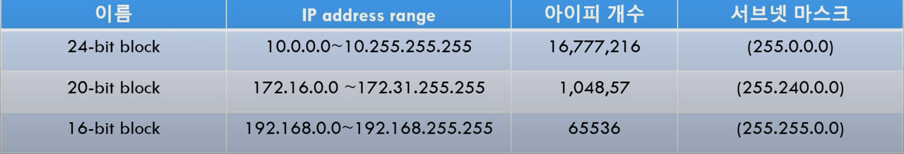 - 즉 해당 범위의 IP 를 부여받은 다면 이는 무조건 사설망이다. (ex. 내 IP 를 확인해봤는데 10.0.0.1이다. => 사설망이다)