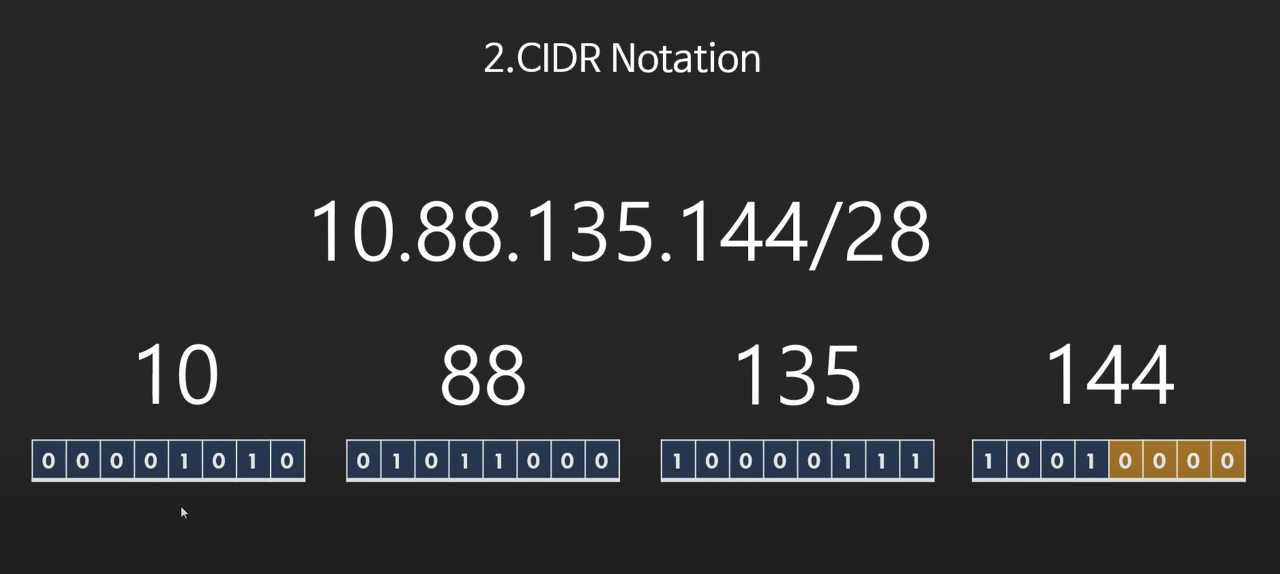 - 여기서 10.88.135.144/28 의 의미는 아래와 같다. 즉 10.88.135.144 는 사설망의 범위의 시작점을 얘기한다.