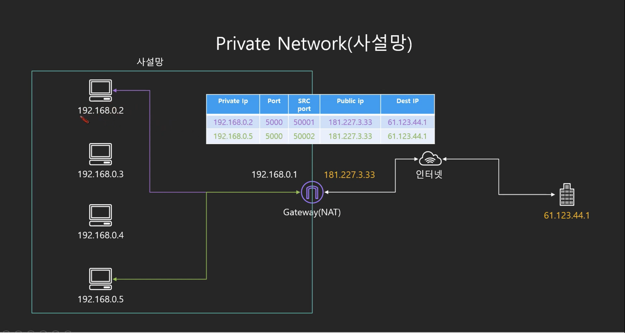 - 하나의 망에는 Private ip 를 부여받은 기기들과 gateway로 구성